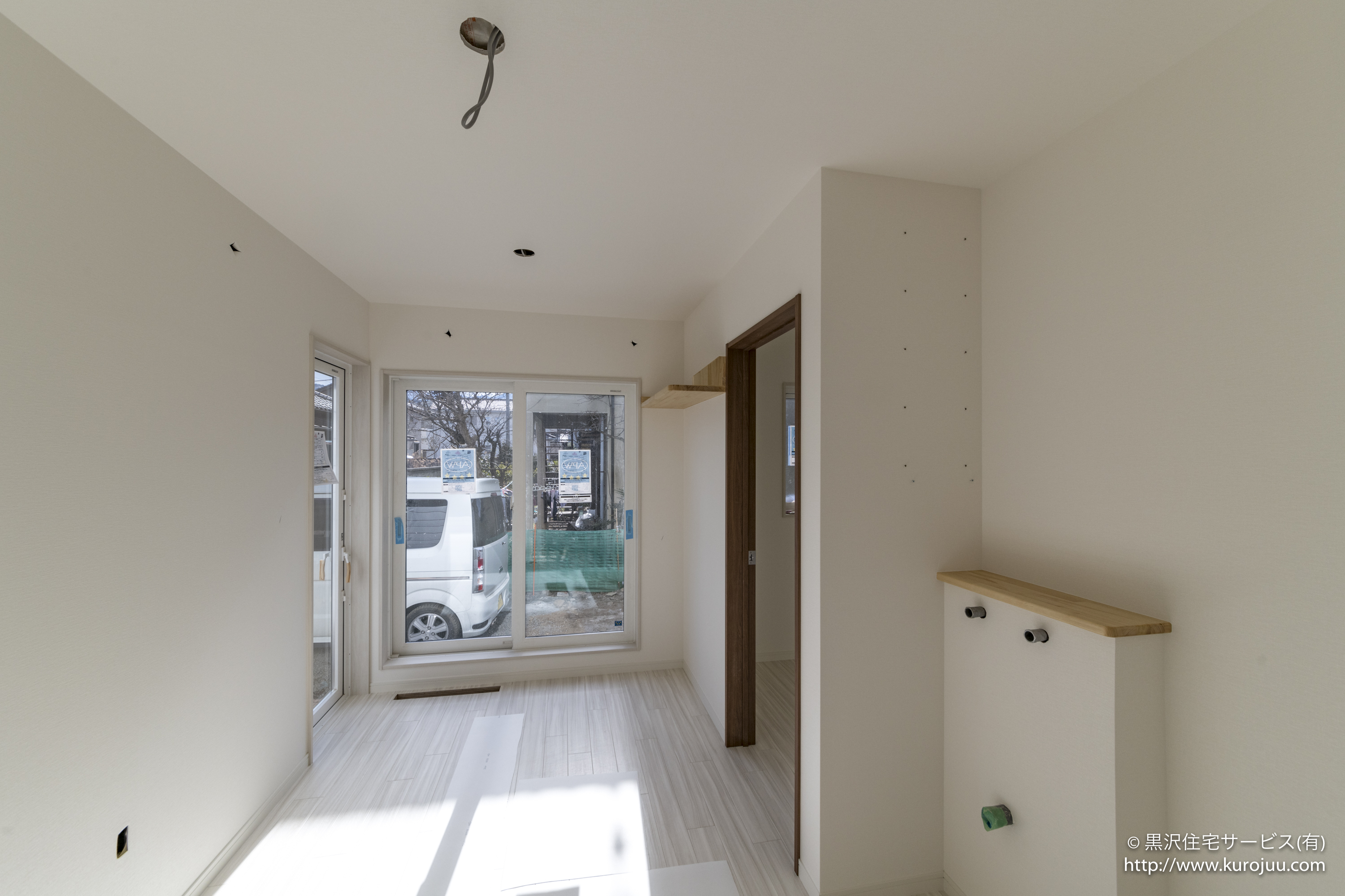 吹き抜けや、L時、角に掃き出しのサッシを取り付ける場合、偏心率が悪く外部の耐力壁だけでは無く、内部にも耐力壁が必要になる為、角45mm×90mm(一方向)両面 石膏ボード厚12.5mm下地 3.9倍の壁倍率の耐力壁も施工しています。
