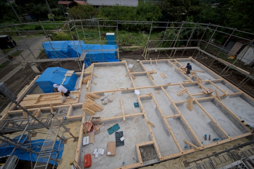 基礎内部を室内の空間と考え丁寧に基礎を仕上げ、気密パッキンと地熱の利用を考え断熱施工をしています。
