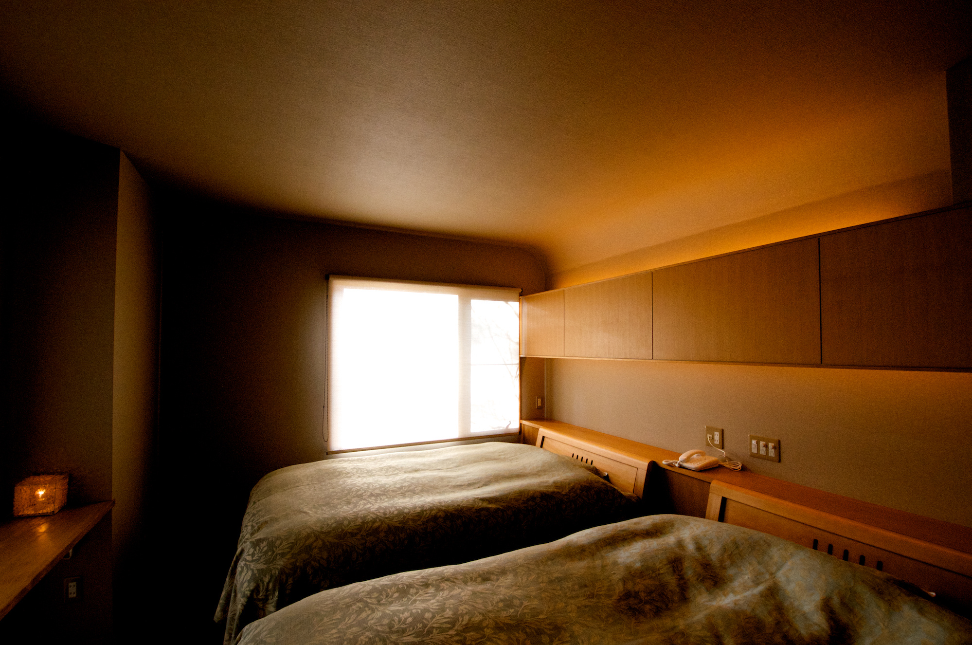 照明を点けた時の、明るいクロスの細かな模様の陰影。
